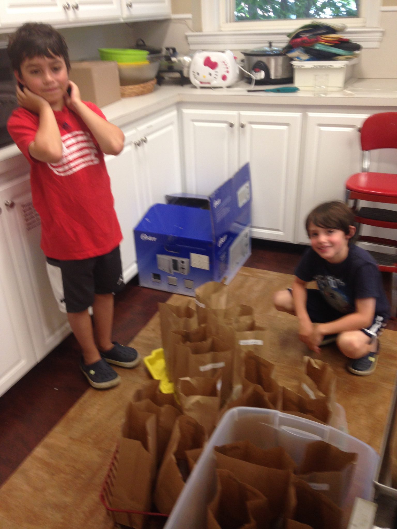 Early in the summer we donated to and helped sort clothes for families in need at the Cradles to Crayons factory in Brighton, Massachusetts. Our job was to inspect the clothes, check them for rips and stains, and then put the acceptable ones in the appropriate bins for distribution. The boys (ages 8&7) had fun turning their task into a basketball game. I’d like to say it all went perfectly, but my older son had a meltdown toward the end (see exhibit B, photo below).